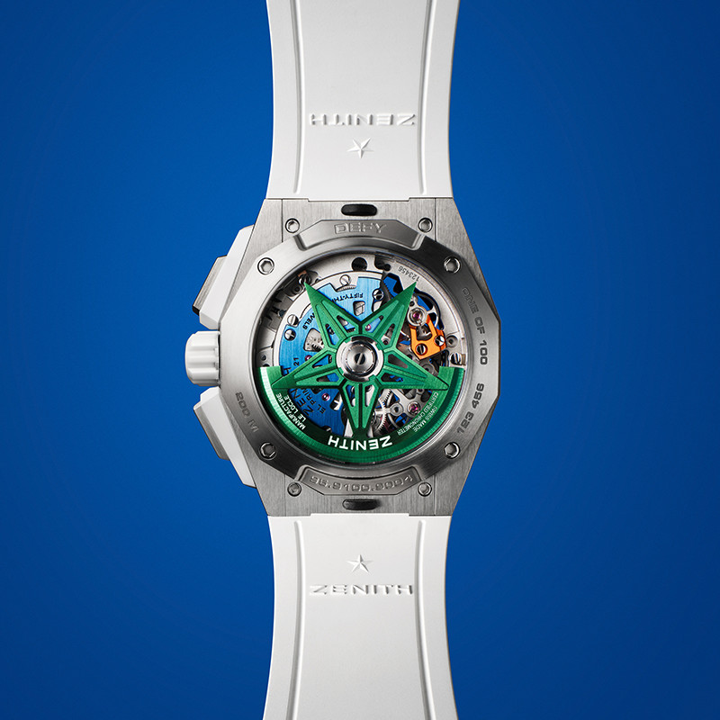 Within, the spectacle continues. The El Primero 9004 calibre, an engineering marvel capable of measuring 1/100th of a second, reveals its “mechanical rainbow” through an openworked dial. Bridges treated with a spectrum of PVD hues breathe life into the movement, while the gradient markers and coloured hands trace time with poetic vibrancy. The signature rotor, in electric blue or radiant green, completes the visual symphony.