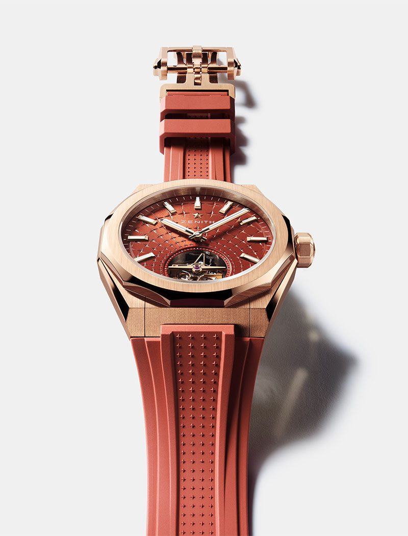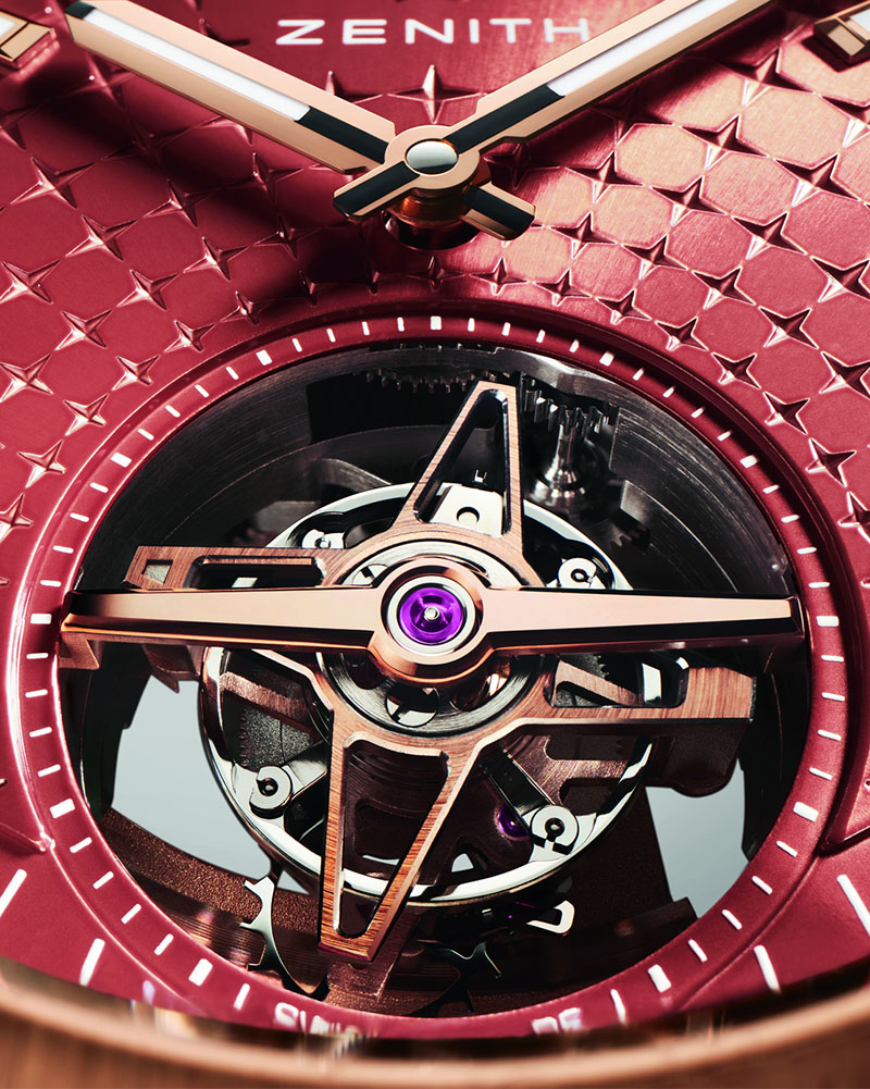At its heart lies a deep brick-red dial, an homage to the Maison’s historic Manufacture in Le Locle, renowned for its red-and-white brickwork. The dial’s engraved four-pointed star pattern radiates from the tourbillon aperture, symbolizing the starry skies that have guided ZENITH since 1865.