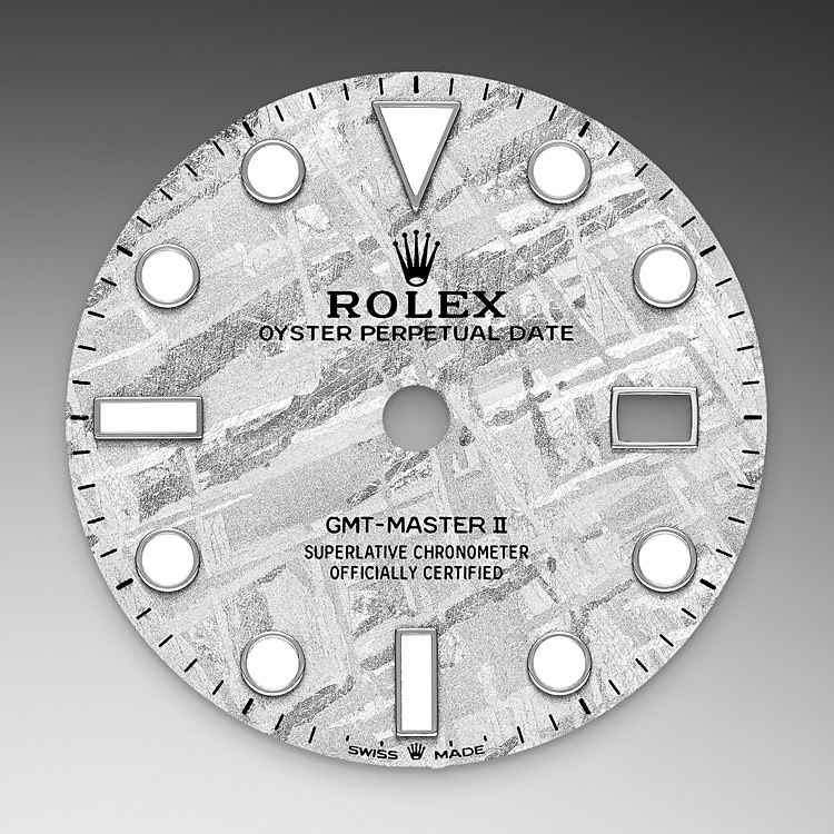 This model is the only GMT-Master II with a meteorite dial. Meteorite comes from the heart of an asteroid or possibly even a planet that has exploded, propelling material across the Solar System until chance brings it into our planet’s orbit and gravity pulls it to Earth. During its journey, the centre of the meteorite is gradually transformed, producing highly unusual metallic patterns, resulting from the very slow cooling of molten asteroid cores. The designers at Rolex create from these configurations a unique treasure for some of the most prestigious models, including this GMT-Master II.