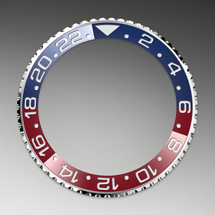 Bidirectional rotatable 24-hour graduated bezel. Two-colour blue and red Cerachrom insert in ceramic, moulded numerals and graduations -